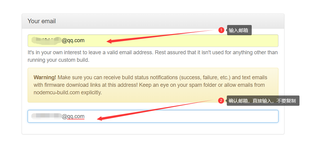 输入你的邮箱,注意确认邮箱直接输入,不要复制上方邮箱,此邮箱用于接收构建好的固件。