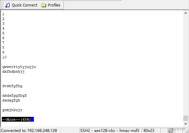 可以使用键盘上的向上键向下键进行向上一行和向下一行查看, 按回车可以下一行 , 按空格可以下一页 , q退出查看