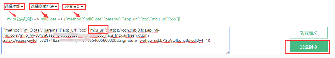 进入调试之后,我们需要测试OTA指令的可行性。即我们在下方的发送指令部分,选择 miio(公共功能) ,选择 milO.ota测试方法,选择相应指令,然后将第二步上传的固件的链接复制到指令中的 mcu_url 处,这里的下载链接直接通过如图二上传好了的固件中的 查看详情 处获取。最后我们发送指令,当收到返回结果为 ok 便表示发送成功。