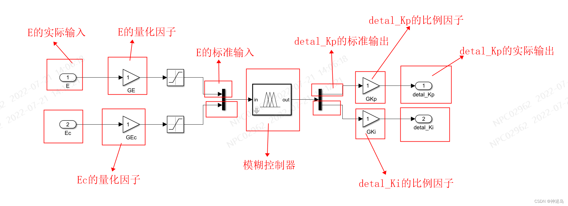 输入:E为误差,Ec为误差变化率,输出:detal_Kp为△KP,detal_Ki为△Ki; 中间: GE、GEc为误差和误差变化率的量化因子,GKP,GKi为detal_Kp和detal_Ki的比例因子