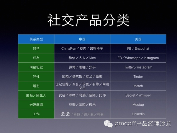 而且,因为互联网的马太效应,大者恒大,一个关系类型的产品市场,只会有一两家比较有规模的产品出现。