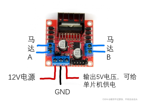 L298n电源接口的接线:电源12V正极→L298n正极 电源12V负极、单片机GND→L298n的GND