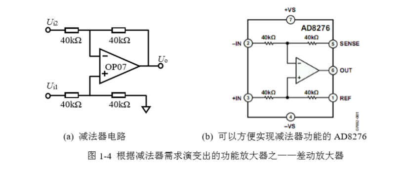 比如我们要设计一个放大电路,实现 Uo=Ui1- Ui2。使用运放可以给出图 1-4(a)所示的 电路。但是,在实现过程中,用户可能遇到 4 个电阻不好匹配的问题,而这个电路又是很 常见的,于是集成电路生产商(比如 ADI 公司)就把这个电路集成在一个叫做 AD8276 的 集成电路中,这就是一种功能放大器,被称为差动放大器——Difference Amplifier。