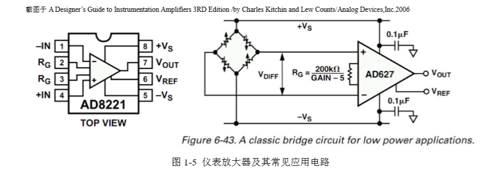 图 1-5 左边是 ADI 公司生产的 AD8221 管脚图,可以看出它有两个输入端-IN 和+IN, 一个输出端 VOUT,2 脚和 3 脚之间需要用户连接一个电阻,以决定仪表放大器的电压增 益。图 1-5 右边电路中给出了 AD627 的电压增益公式,电阻 RG越小,增益越大。