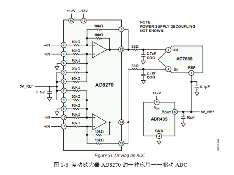 以图 1-6 所示的 AD8270 为例,可以看出它内部由两个独立的差动放大器组成,每个 差动放大器都有 7 个电阻,用户可以在芯片外部对它们进行合适的连接,以实现不同的功 能。图 1-6 仅是一种连接方式,作为一个 AD 转换器 AD7688 的前级驱动电路。