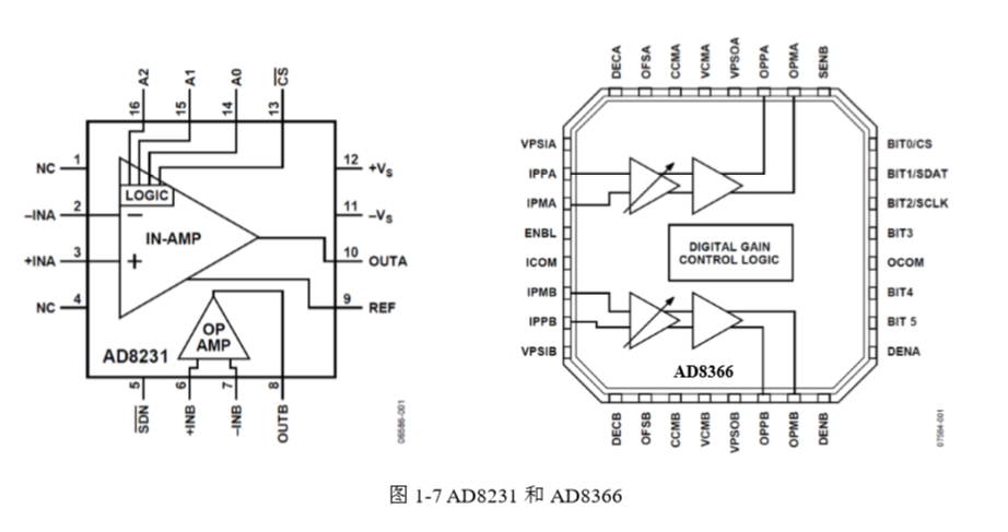ADI 公司生产的程控增益放大器主要分为两类:低频段的精确增益型,以及高频段 的。图 1-7 是低频段的 AD8231 和高频段的 AD8366。