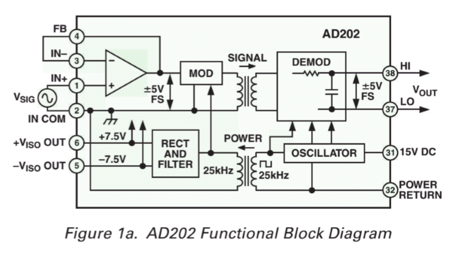 需要特别注意的是,隔离放大器只能放大低频信号,像 AD202 只有 2kHz 的带宽。