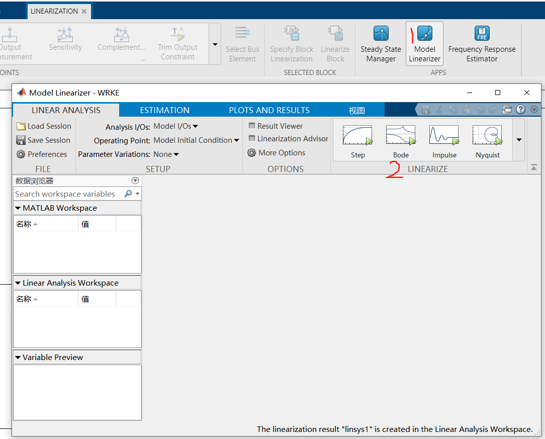 4.响应分析,以BODE图为例:点击Model Linearizer,弹出工具框,然后选择“Bode”。
