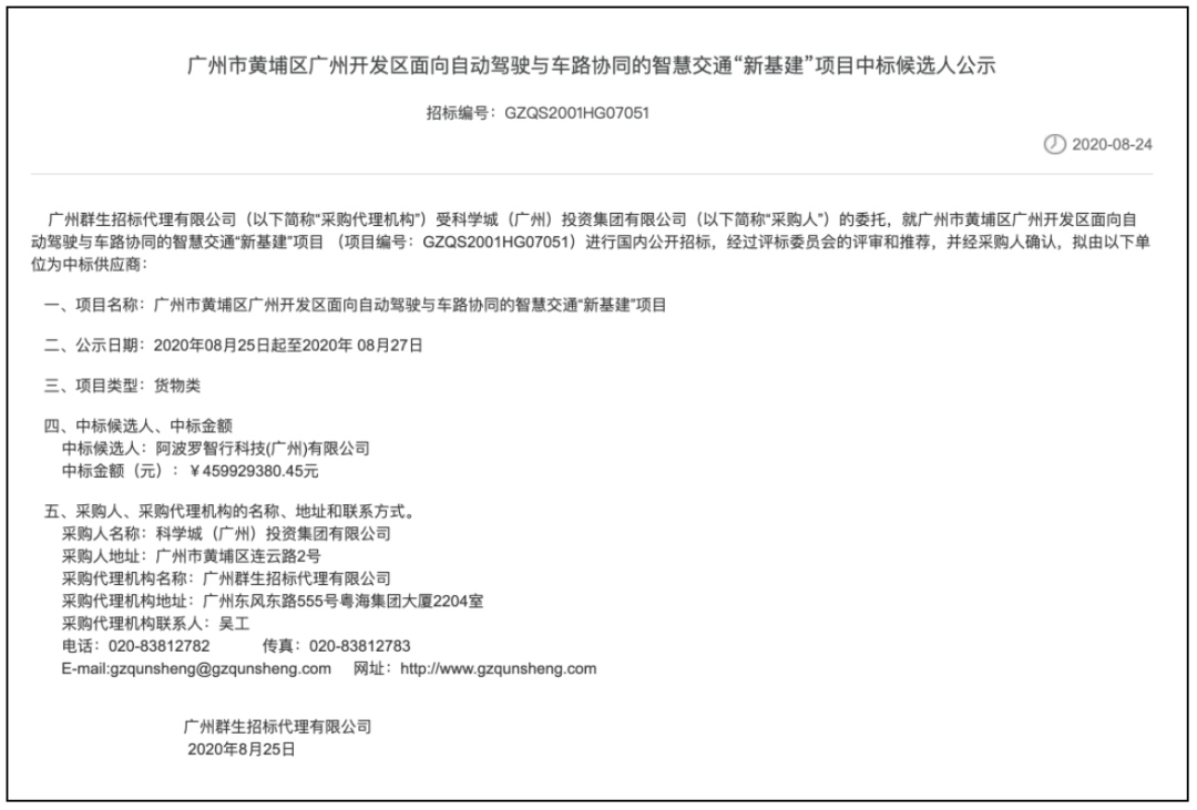 2020年8月28日,百度Apollo旗下子公司阿波罗智行科技(广州)有限公司中标“广州市黄埔区广州开发区面向自动驾驶与车路协同的智慧交通‘新基建’项目”,采购人为科学城(广州)投资集团有限公司,项目金额接近4.6亿元。该项目金额或为今年国内智能交通领域的最大招标项目订单。