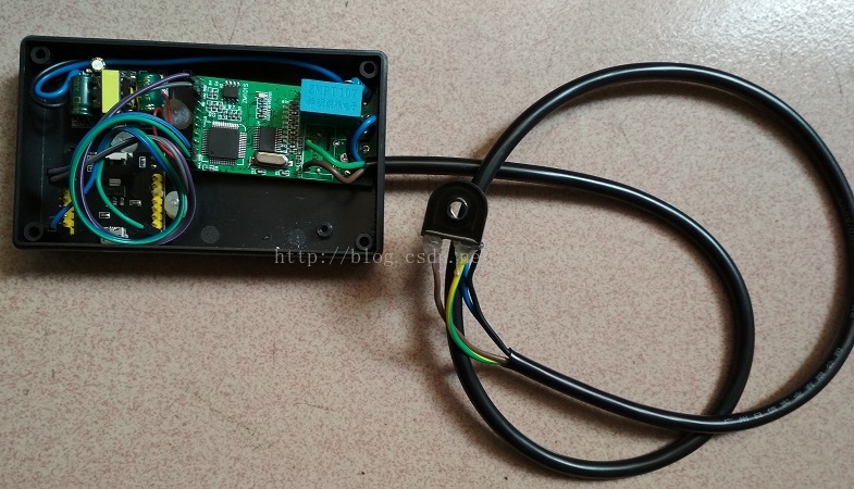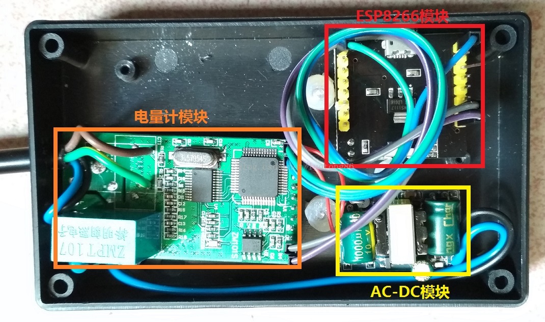 硬件由三部分组成,电量计模块,ESP8266模块和AC-DC模块。AC-DC提供5V工作电压,8266通过串口从电量计模块获取到电量信息,包括功率,电压和电量等主要参数。在家里找到了一个之前买的塑料外壳,把它们几个安装到里面,效果如下,电量计模块往外接出4根线,两根监测电压,两根监测电流。