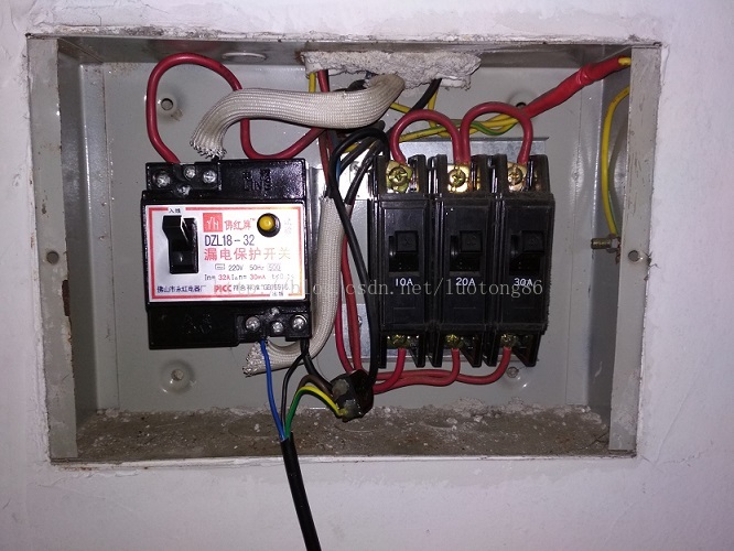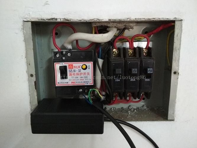我租的房子里面的接线盒,老古董了,把监测电压的两根线接到漏电开关出线端,互感器穿到火线上,如下图