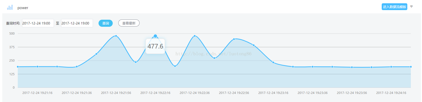 把采集到的电量信息上传到oneNET物联网平台,实时功率监测效果如下,截图的时候刚好洗衣机在工作,甩水时电机转一下停一下,形成了多个波峰和波谷