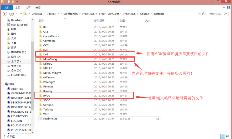 重点来看一下 portable这个文件夹,FreeRTOS 是个系统,归根结底就是个纯软件的东西,它是怎么和硬件联系在一起的呢?软件到硬件中间必须有一个桥梁,portable 文件夹里面的东西就是 FreeRTOS系统和具体的硬件之间的连接桥梁!不同的编译环境,不同的 MCU,其桥梁应该是不同的,打开 portable 文件夹,如下图所示: