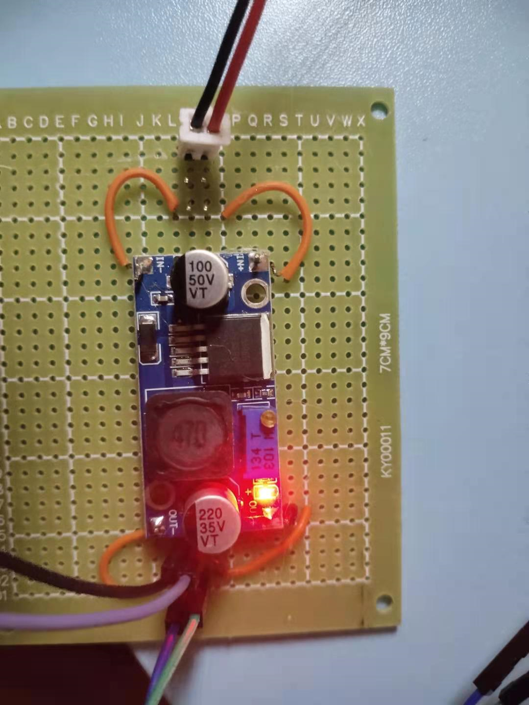 一个L298N电机驱动模块可以控制两个直流电机或者一个两相步进电机。支持两个电压的供电模式,5V或者12V。由于没有5V,12V的电源,所以我们用了15V的电源进行降压处理后为5V给其供电。使用5V的电压也是因为可以直接给单片机直接供电,可以将单片机与电脑分离开来。如果没有电源的话,也可以直接使用单片机5V电压给电机驱动模块提供电压。降压模块如下图,使用DC-DC模块焊的一个电路板。(其实电源就是12V的只是为了多加一个模块)DC-DC模块用时一定分清正负,要不然电容会炸的。黄色的纽扣扭动可以调节输出电压。