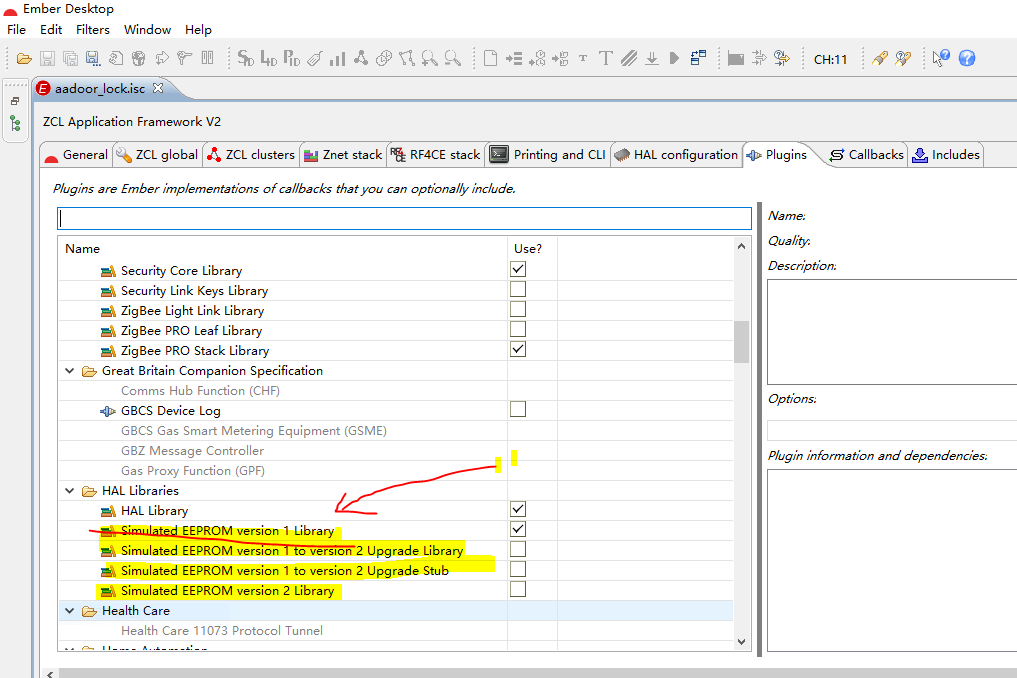 本篇文章简单介绍一下em3xx系列芯片虚拟eeprom的用法,em3xx芯片本身并没有实际的eeprom ,所以它提供flash作为eeprom得sim-eeprom的用法。 库提供了两个版本的sim-eeprom用法。可以在ember desktop中plugin中进行选择(如下图):