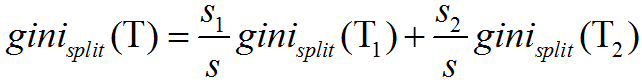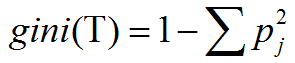 其中,pj是指类别j在样本集T中出现的概率。若我们将T划分为T1、T2两个子集,则此次划分的gini系数的值可由下式计算: