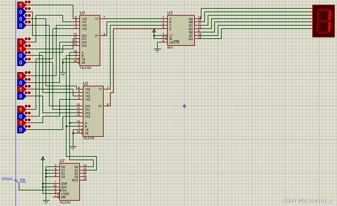 当然也可以不使用JK触发器,怎么简单怎么来,使用74LS161芯片是一样的,数据选择器选用74LS153芯片,译码器则选用CD4511芯片,而数码管要使用七段共阴极数码管。