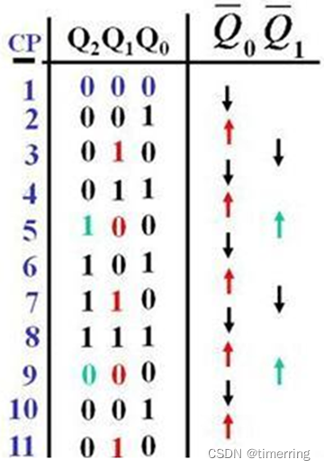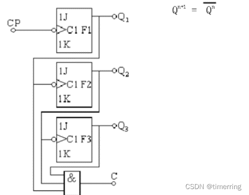 按照上述规律,当第七个脉冲输入时,计数器状态为111。如输入第八个脉冲,计数器状态变成000,并产生一个向高位的进位信号。