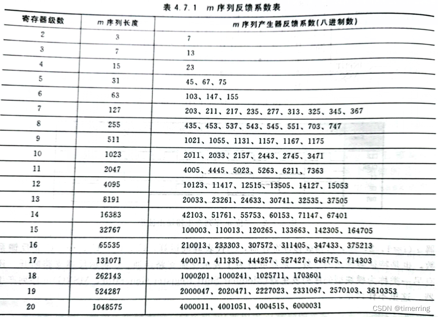 通常,将类似于上图所示电路结构的m序列产生器称为简单型码序列发生器(Simple Shift Register Generator,SSRG),它的一般结构如图4.7.4所示、其中各个触发器构成位移寄存器。M序列反馈系数表如下所示:
