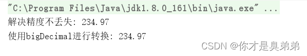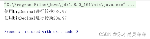 结果可以看出使用new BigDecimal(234.97),传入参数为double类型发生精度丢失,运行的结果并不等于234.97,而是为234.969999999999998863131622783839702606201171875。