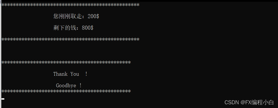 2.常用的功能有:用户输入密码登录界面;取款界面;取款后的取款金额以及剩余显示,退出功能等等