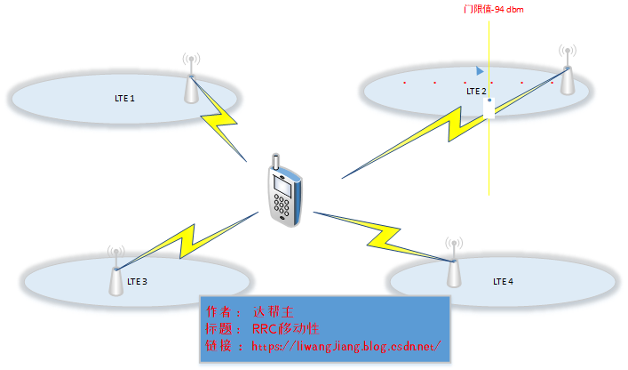 可以通过上图距离,比如说 UE选择了LTE 2小区为UE提供服务,对于这个UE来说 LTE 2 就是UE的服务小区。UE在这个小区是需要接收这个小区的信号质量以及信号电平。服务小区好于某个门限值,前面的服务小区是指UE在小区中所接收到的信号质量或信号电平,好于某个们限制,这个门限值是我们需要先定义的一个参数。比如我们把门限值定义为-94dbm,我们这里是通过rsrp信号质量来进行判断依据,在LTE2小区内是有不同的点,每个点信号或信号电平都不同,就是距离基站越,信号质量越差。