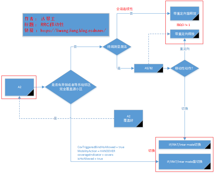 UE在小区边缘的位置移动UE会测量信号电平值测量的时候他会跟A2事件去做对比,看是否满足A2事件,比如A2定义的是一个弱覆盖 (就是UE测量的信号电平要比某一个门限值查)的事件,如果满足A2事件UE移动到基站的边缘,弱覆盖区域,那么UE是会向基站报告A2事件,基站收到A2事件后,基站知道UE移动到了一个弱覆盖区域,那么基站将会做一个判决,看是否需要向UE做重定向或小区切换(可以看上图,A2事件后面的判断<是否有异频或者异系统邻区完全覆盖源小区>),如果判断 异频或者异系统邻区完全覆盖源小区,就会检查这几个参数(covTriggeredBindHoAllowed=true , mobilityAction=HANDOVER , coveragelindicator=covers, isHoAllowed = true)如果参数都是以上参数,那么UE会进行盲切 。