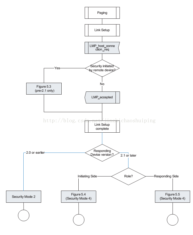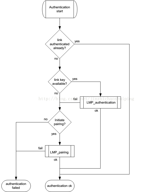 一般的同用鉴别流程,描述了LMP-身份鉴别和LMP-配对当身份鉴别被一个设备向另一个设备初始化了.取决于密码是否存在或者配对是否被允许.