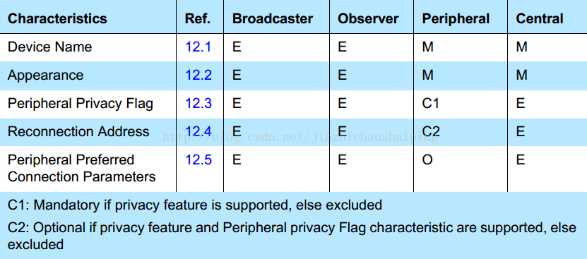 每一个GAP角色设备的特性要求将在表12.1中显示.一个设备只能有一个GAP服务的实例.一个GAP服务是带有服务UUID的以GATT为基础的服务.