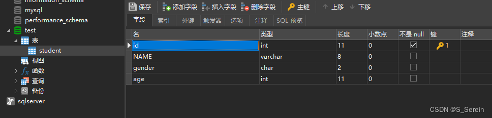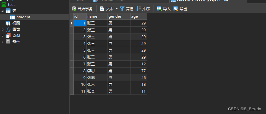 1.创建student表,包含id、name、gender、age,插入至少5条记录。