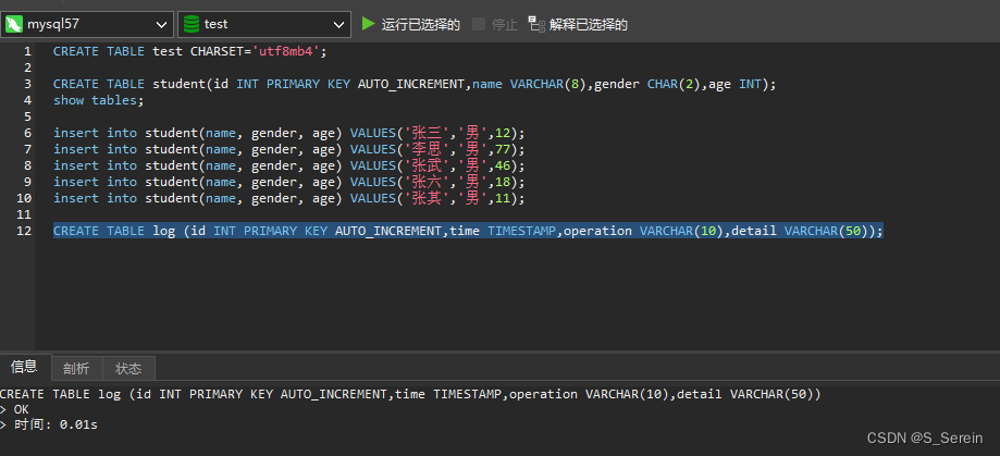 以上就是欣慰万宝路最近收集整理的关于在数据库中创建触发器一.创建数据库。二,创建学生表三,创建日志表四、创建触发器(五) 查看触发器(六) 测试触发器的全部内容,更多相关在数据库中创建触发器一内容请搜索靠谱客的其他文章。