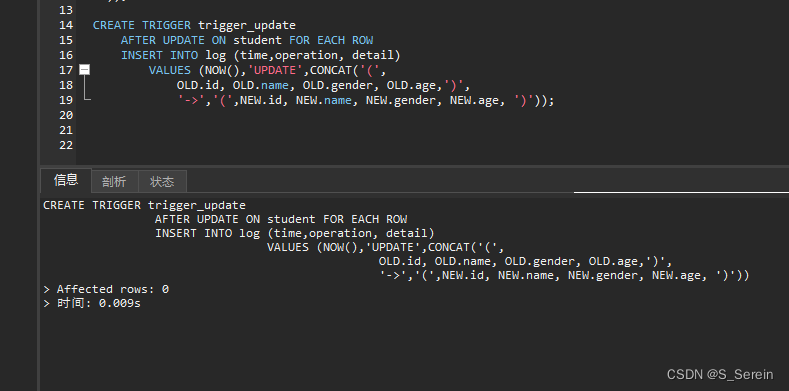 - 针对student创建插入触发器 trigger_update 执行命令:CREATE TRIGGER trigger_update