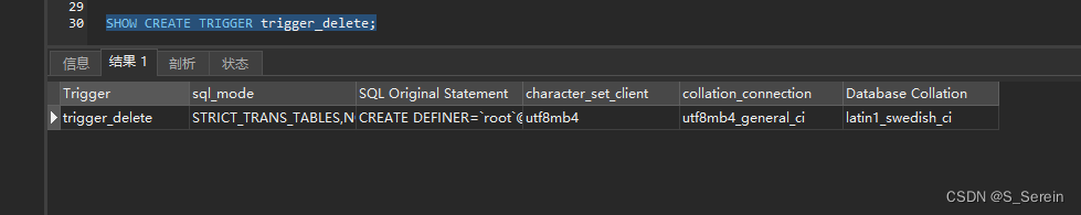 执行命令:SHOW CREATE TRIGGER trigger_delete;