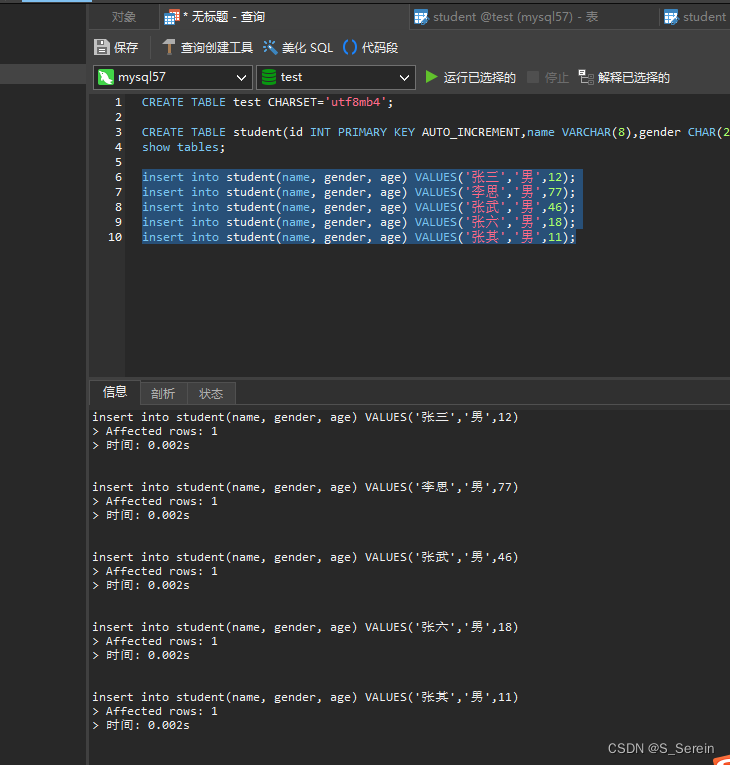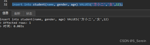 插入一条新记录,执行语句:insert into student(name, gender, age) VALUES('方小二','女',12);