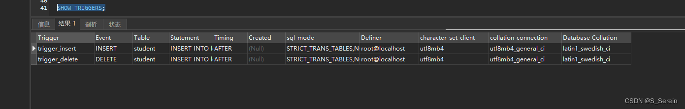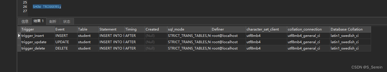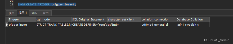 (1)查看插入触发器的语句 执行命令:SHOW CREATE TRIGGER trigger_insert;
