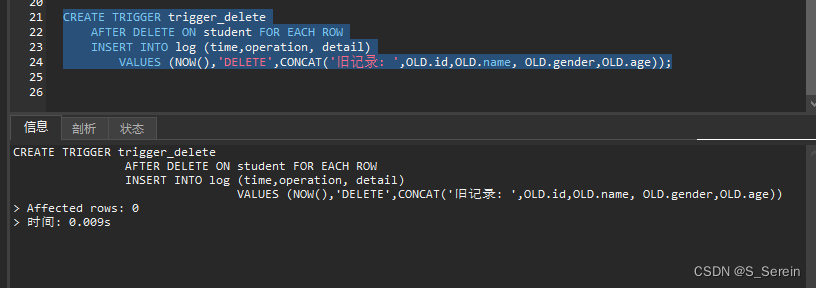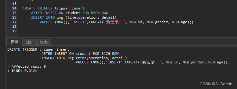 - 针对student创建插入触发器 trigger_insert 执行语句:CREATE TRIGGER trigger_insert