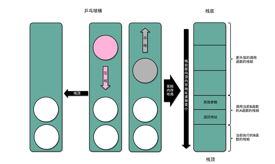 最终,计算机科学家们想到了一个比单独记录跳转回来的地址更完善的办法。我们在内存里面开辟一段空间,用栈这个后进先出(LIFO,Last In First Out)的数据结构。