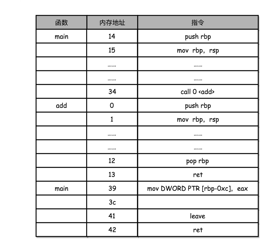 而在函数 add 执行完成之后,又会分别调用第 12 行的 pop rbp 来将当前的栈顶出栈,这部分操作维护好了我们整个栈帧。然后,我们可以调用第 13 行的 ret 指令,这时候同时要把 call 调用的时候压入的 PC 寄存器里的下一条指令出栈,更新到 PC 寄存器中,将程序的控制权返回到出栈后的栈顶。指令地址本身的压栈和出栈是在 call 和 ret 的部分进行的。