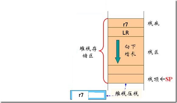 程序用到了r7寄存器,所以需要保护以免破坏之前的数据,同时因为本函数调用子函数f1,需要用到lr寄存器保存返回值,故需要保存LR到栈里: