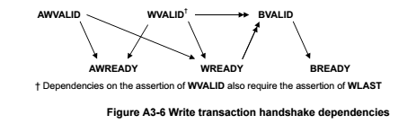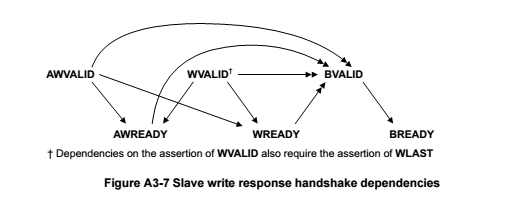 如图所示,这是写处理当中,三个通道握手信号的相关关系,可以看见一共有三对,因为在写行为当中一共有三个通道,AW,W,B通道,同样官方给出一些注解,但是官方给出的比较混乱,