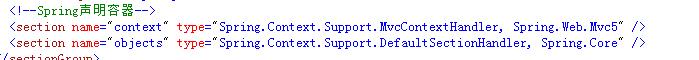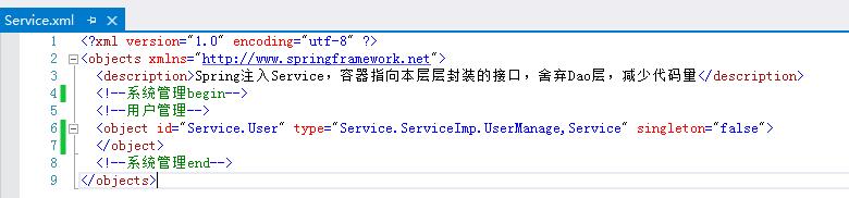 1 <?xml version="1.0" encoding="utf-8" ?> 2 <objects xmlns="http://www.springframework.net"> 3 <description>Spring注入Service,容器指向本层层封装的接口,舍弃Dao层,减少代码量</description> 4 <!--系统管理begin--> 5 <!--用户管理--> 6 <object id="Service.User" type="Service.ServiceImp.UserManage,Service" singleton="false"> 7 </object> 8 <!--系统管理end--> 9 </objects>