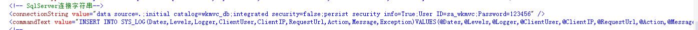 1 <?xml version="1.0" encoding="utf-8"?> 2 <configuration> 3 <configSections> 4 <section name="log4net" type="log4net.Config.Log4NetConfigurationSectionHandler,log4net"/> 5 </configSections> 6 <log4net> 7 <root> 8 <level value="ALL"/> 9 </root> 10 <logger name="dblog" additivity="false"> 11 <level value="ALL"/> 12 <appender-ref ref="SqlServerAppender" /> 13 </logger> 14 <!--Oracle数据库--> 15 <appender name="OracleAppender" type="log4net.Appender.AdoNetAppender"> 16 <!-- Oracle数据源--> 17 <connectionType value="Oracle.ManagedDataAccess.Client.OracleConnection, Oracle.ManagedDataAccess, Version=4.121.2.0, Culture=neutral, PublicKeyToken=89b483f429c47342" /> 18 <!-- Oracle连接字符串--> 19 <connectionString value="DATA SOURCE=(DESCRIPTION=(ADDRESS_LIST=(ADDRESS=(PROTOCOL=TCP)(HOST=192.168.3.206)(PORT=1521)))(CONNECT_DATA=(SERVICE_NAME=orcl)));PASSWORD=watdb;PERSIST SECURITY INFO=True;USER ID=watdb;"/> 20 <commandText value="INSERT INTO SYS_LOG(Dates,Levels,Logger,Message,Exception,ClientUser,ClientIP,RequestUrl,Action)VALUES(:Dates,:Levels,:Logger,:Message,:Exception,:ClientUser,:ClientIP,:RequestUrl,:Action)"/> 21 <!-- 22 设置缓存区大小 23 1表明有一条日志就要写入 24 如果10就表示日志到达10条时一起写入 25 --> 26 <bufferSize value="0"/> 27 <parameter> 28 <parameterName value=":Dates" /> 29 <dbType value="DateTime" /> 30 <layout type="log4net.Layout.RawTimeStampLayout"/> 31 </parameter> 32 <parameter> 33 <parameterName value=":Levels" /> 34 <dbType value="String" /> 35 <size value="50" /> 36 <layout type="log4net.Layout.PatternLayout"> 37 <conversionPattern value="%level" /> 38 </layout> 39 </parameter> 40 <parameter> 41 <parameterName value=":Logger" /> 42 <dbType value="String" /> 43 <size value="200" /> 44 <layout type="log4net.Layout.PatternLayout"> 45 <conversionPattern value="%logger" /> 46 </layout> 47 </parameter> 48 <parameter> 49 <parameterName value=":Message" /> 50 <dbType value="String" /> 51 <size value="4000" /> 52 <layout type="log4net.Layout.PatternLayout"> 53 <conversionPattern value="%message" /> 54 </layout> 55 </parameter> 56 <parameter> 57 <parameterName value=":Exception" /> 58 <dbType value="String" /> 59 <size value="4000" /> 60 <layout type="log4net.Layout.PatternLayout"> 61 <conversionPattern value="%exception" /> 62 </layout> 63 </parameter> 64 <!--DIY--> 65 <parameter> 66 <parameterName value=":ClientUser" /> 67 <dbType value="String" /> 68 <size value="100" /> 69 <layout type="log4net.Layout.PatternLayout"> 70 <conversionPattern value="%property{ClientUser}" /> 71 </layout> 72 </parameter> 73 <parameter> 74 <parameterName value=":ClientIP" /> 75 <dbType value="String" /> 76 <size value="20" /> 77 <layout type="log4net.Layout.PatternLayout"> 78 <conversionPattern value="%property{ClientIP}" /> 79 </layout> 80 </parameter> 81 <parameter> 82 <parameterName value=":RequestUrl" /> 83 <dbType value="String" /> 84 <size value="500" /> 85 <layout type="log4net.Layout.PatternLayout"> 86 <conversionPattern value="%property{RequestUrl}" /> 87 </layout> 88 </parameter> 89 <parameter> 90 <parameterName value=":Action" /> 91 <dbType value="String" /> 92 <size value="20" /> 93 <layout type="log4net.Layout.PatternLayout"> 94 <conversionPattern value="%property{Action}" /> 95 </layout> 96 </parameter> 97 </appender> 98 <!--Sqlite数据库--> 99 <appender name="SqliteAppender" type="log4net.Appender.AdoNetAppender"> 100 <bufferSize value="0" /> 101 <connectionType value="System.Data.SQLite.SQLiteConnection, System.Data.SQLite, Version=1.0.98.0, Culture=neutral, PublicKeyToken=db937bc2d44ff139" /> 102 <connectionString value="Data Source=|DataDirectory|test.db;Version=3;" /> 103 <commandText value="INSERT INTO Log (Date, Level, Logger, ClientUser,ClientIP, RequestUrl,Action, Message, Exception) VALUES (@Date, @Level, @Logger,@ClientUser,@ClientIP, @RequestUrl,@Action, @Message, @Exception)" /> 104 <parameter> 105 <parameterName value="@Date" /> 106 <dbType value="DateTime" /> 107 <layout type="log4net.Layout.RawTimeStampLayout" /> 108 </parameter> 109 <parameter> 110 <parameterName value="@Level" /> 111 <dbType value="String" /> 112 <layout type="log4net.Layout.PatternLayout"> 113 <conversionPattern value="%level" /> 114 </layout> 115 </parameter> 116 <parameter> 117 <parameterName value="@Logger" /> 118 <dbType value="String" /> 119 <layout type="log4net.Layout.PatternLayout"> 120 <conversionPattern value="%logger" /> 121 </layout> 122 </parameter> 123 <parameter> 124 <parameterName value="@ClientUser" /> 125 <dbType value="String" /> 126 <layout type="log4net.Layout.PatternLayout"> 127 <conversionPattern value="%property{ClientUser}" /> 128 </layout> 129 </parameter> 130 <parameter> 131 <parameterName value="@ClientIP" /> 132 <dbType value="String" /> 133 <layout type="log4net.Layout.PatternLayout"> 134 <conversionPattern value="%property{ClientIP}" /> 135 </layout> 136 </parameter> 137 <parameter> 138 <parameterName value="@RequestUrl" /> 139 <dbType value="String" /> 140 <layout type="log4net.Layout.PatternLayout"> 141 <conversionPattern value="%property{RequestUrl}" /> 142 </layout> 143 </parameter> 144 <parameter> 145 <parameterName value="@Action" /> 146 <dbType value="String" /> 147 <layout type="log4net.Layout.PatternLayout"> 148 <conversionPattern value="%property{Action}" /> 149 </layout> 150 </parameter> 151 <parameter> 152 <parameterName value="@Message" /> 153 <dbType value="String" /> 154 <layout type="log4net.Layout.PatternLayout"> 155 <conversionPattern value="%message" /> 156 </layout> 157 </parameter> 158 <parameter> 159 <parameterName value="@Exception" /> 160 <dbType value="String" /> 161 <layout type="log4net.Layout.PatternLayout"> 162 <conversionPattern value="%exception" /> 163 </layout> 164 </parameter> 165 </appender> 166 <!--SqlServer数据库--> 167 <appender name="SqlServerAppender" type="log4net.Appender.AdoNetAppender"> 168 <!-- SqlServer数据源--> 169 <connectionType value="System.Data.SqlClient.SqlConnec
