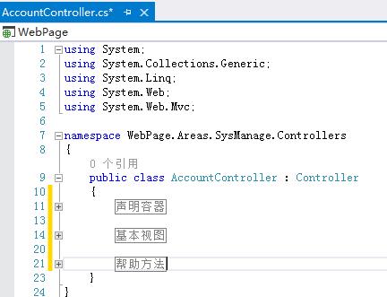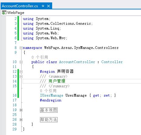 个人习惯,我们分块控制器的代码,便于收缩、管理 用#region #endregion,#region是c#预处理器指令,是一个分块预处理命令,它主要用于编辑代码的分段,在编译时会被自动删除。
