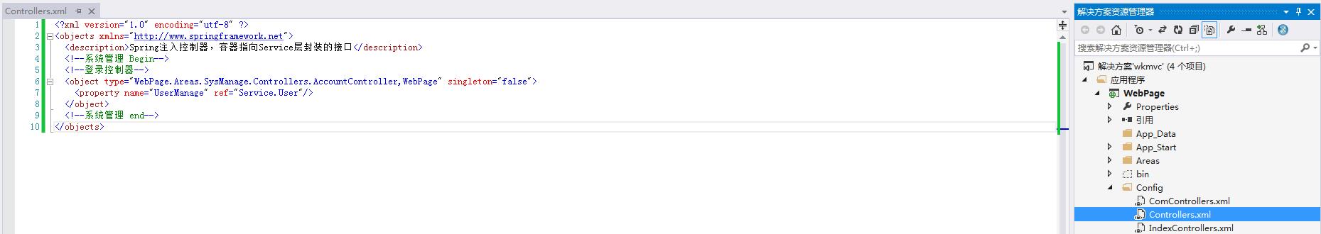 1 <?xml version="1.0" encoding="utf-8" ?> 2 <objects xmlns="http://www.springframework.net"> 3 <description>Spring注入控制器,容器指向Service层封装的接口</description> 4 <!--系统管理 Begin--> 5 <!--登录控制器--> 6 <object type="WebPage.Areas.SysManage.Controllers.AccountController,WebPage" singleton="false"> 7 <property name="UserManage" ref="Service.User"/> 8 </object> 9 <!--系统管理 end--> 10 </objects>
