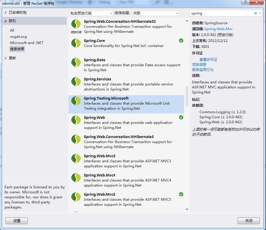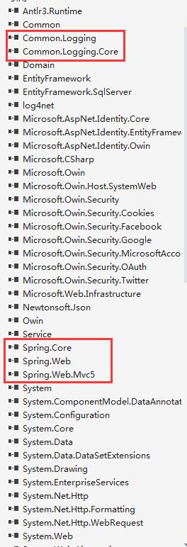我们的Spring有几个dll 分别是Spring.Core、Common.Logging、Spring.Web.Mvc(我们这里用的是Spring.Web.Mvc5)