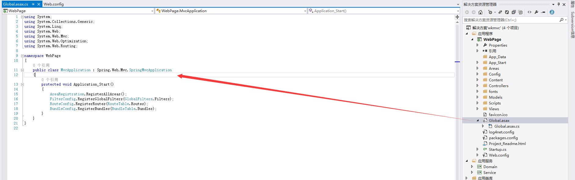 现在运行一下,是不是还是报错呢~~还是为将对象设置引用到实例~~怎么回事呢?好像忘了些什么,仅仅只是配置配好了,spring.net的容器还没有接管这一切……在这我们只需要让Global.asax文件的MvcApplication类继承于Spring.Web.Mvc.SpringMvcApplication类即可,根据需要override相关方就可以了