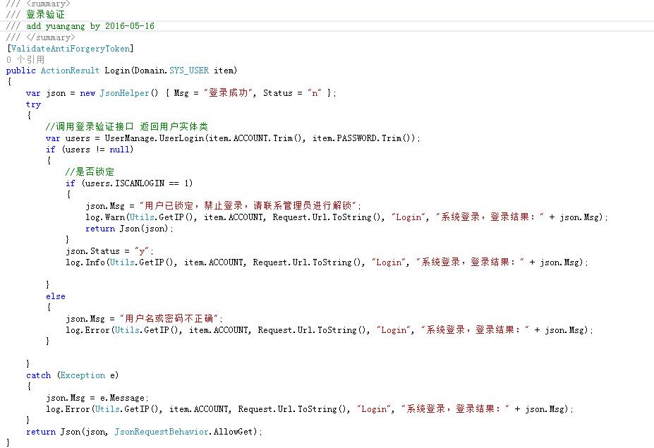 1 /// <summary> 2 /// 登录验证 3 /// add yuangang by 2016-05-16 4 /// </summary> 5 [ValidateAntiForgeryToken] 6 public ActionResult Login(Domain.SYS_USER item) 7 { 8 var json = new JsonHelper() { Msg = "登录成功", Status = "n" }; 9 try 10 { 11 //调用登录验证接口 返回用户实体类 12 var users = UserManage.UserLogin(item.ACCOUNT.Trim(), item.PASSWORD.Trim()); 13 if (users != null) 14 { 15 //是否锁定 16 if (users.ISCANLOGIN == 1) 17 { 18 json.Msg = "用户已锁定,禁止登录,请联系管理员进行解锁"; 19 return Json(json); 20 } 21 json.Status = "y"; 22 23 } 24 else 25 { 26 json.Msg = "用户名或密码不正确"; 27 } 28 29 } 30 catch (Exception e) 31 { 32 json.Msg = e.Message; 33 } 34 return Json(json, JsonRequestBehavior.AllowGet); 35 }