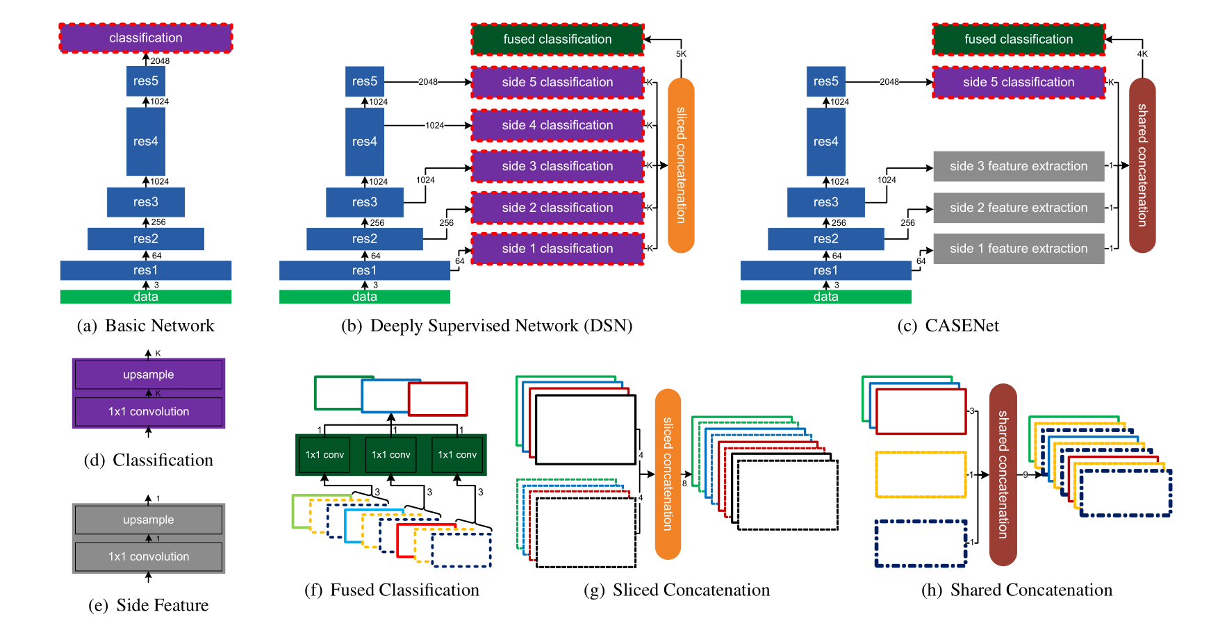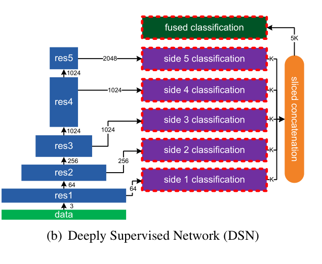 请注意,HED仅执行二进制边缘检测。我们将这种架构扩展到处理用于侧面输出的K通道和用于最终输出的K通道。我们称之为深度监督网络(DSN),如图3(b)所示。在这个网络中,我们将上述分类模块连接到每个剩余块堆栈的输出,生成5个侧面分类激活映射{A(1),…,A(5)},其中每个都有k个通道。然后,我们通过切片连接层(颜色表示图3(g)中的通道索引)融合这5个激活图,以生成一个5K通道激活图: