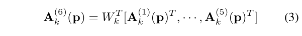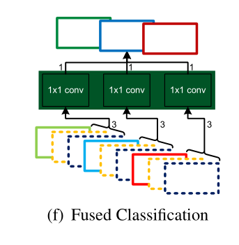 Af 被输入我们的融合分类层,该层执行K-grouped1×1卷积(图3(f))以产生K通道激活mapA(6)(绿色块引出来的)。最后,利用方程1在{A(1),…,A(6)}上计算出6个损失函数,以便对该网络进行深度监控。