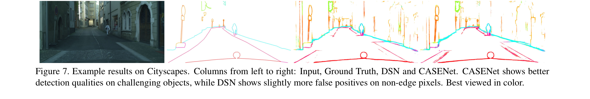 从左到右的列:输入、Cityscapes、DSN和CASENet。